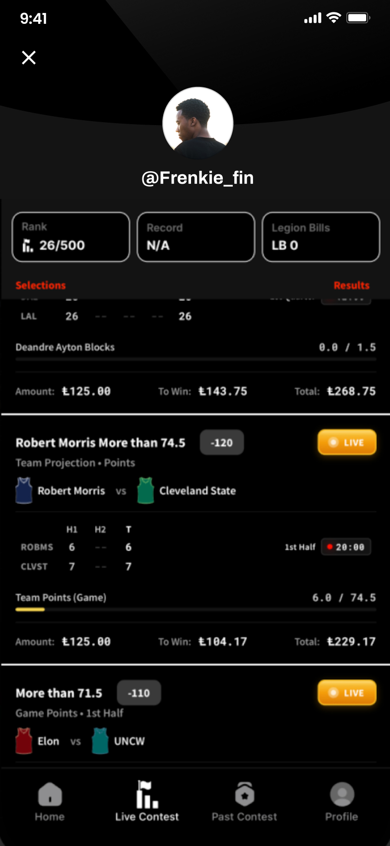 Please refer to the Contest Rules for a detailed breakdown. If a selected game is cancelled before the contest begins, users will be prompted to choose a replacement. If a game is cancelled, postponed, or declared a no contest during the contest, the selection will be marked as a “push,” and the original Legion Bills assigned will be returned to the user.